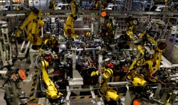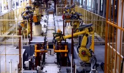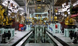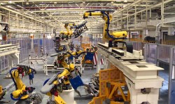 東風日產(chǎn)大連工廠焊裝線由主線、側圍線、機艙線、前后地板線、頂蓋線、滾邊線組成,共有150臺機器人,三車型柔性混流,生產(chǎn)節(jié)拍30JPH;由我公司總承包完成。集成應用伺服夾具、高速滾床輸送、視覺檢測、自動上下線、伺服轉臺、POWERMOTION控制系統(tǒng)、機器人涂膠在線檢測、伺服通用抓手等先進技術。