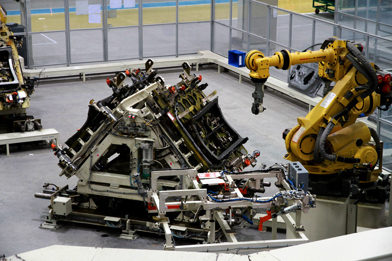 采用機(jī)械、電、氣通用接口,通過機(jī)器人快速換模實(shí)現(xiàn)不同車型的柔性混流生產(chǎn)。開發(fā)了通用滾壓頭可適應(yīng)普通和水滴型包邊。采用柔性?shī)A具、伺服抓手、視覺系統(tǒng)、品質(zhì)再現(xiàn)等焊裝領(lǐng)域的先進(jìn)技術(shù);其中VISION SHIT品質(zhì)再現(xiàn)技術(shù)可大大縮短現(xiàn)場(chǎng)滾邊品質(zhì)調(diào)試時(shí)間。通過不同組合配置的 滾邊島可以滿足從15JPH到60JPH的節(jié)拍要求。